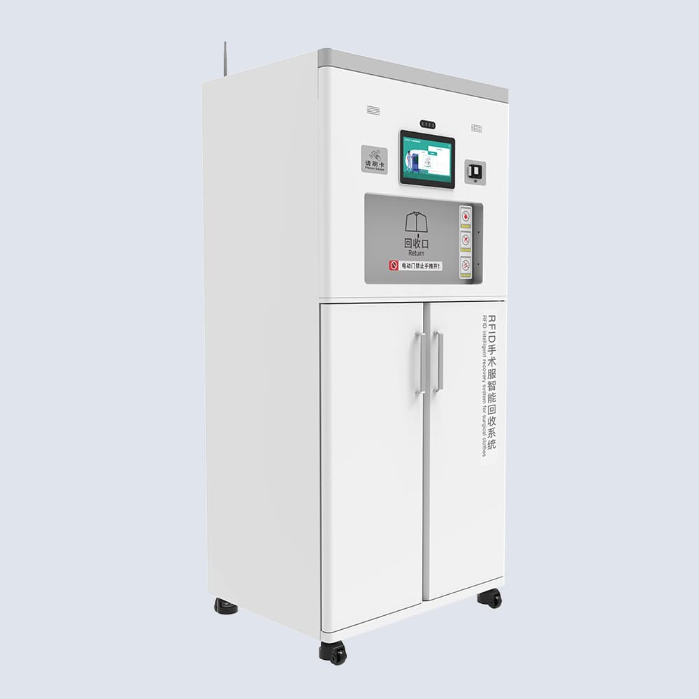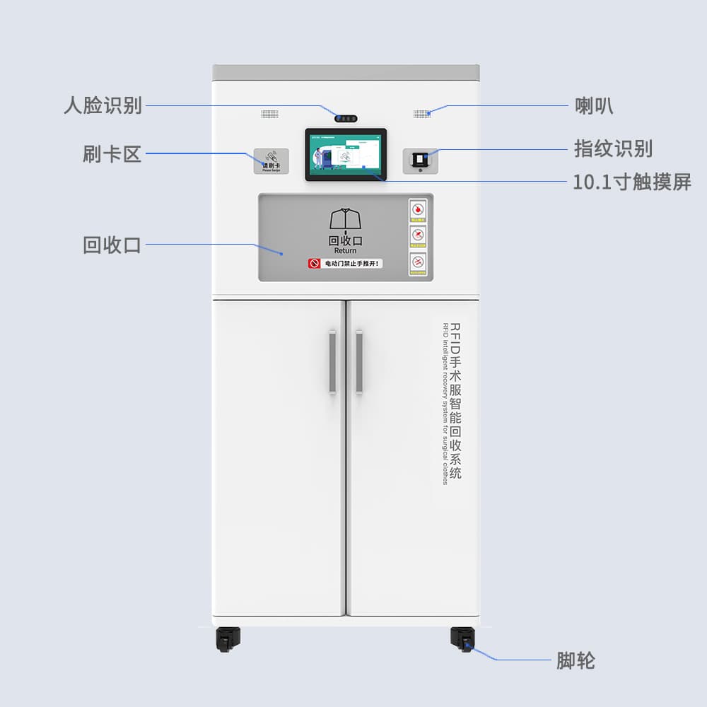 RFID手术衣鞋回收柜集RFID识别技术于一体,实现医护人员手术服、手术鞋的自助回收,即扔即走,无需人工登记,节省宝贵时间,大容量设计,可容纳50套手术服或40双手术鞋,满足日常需求。