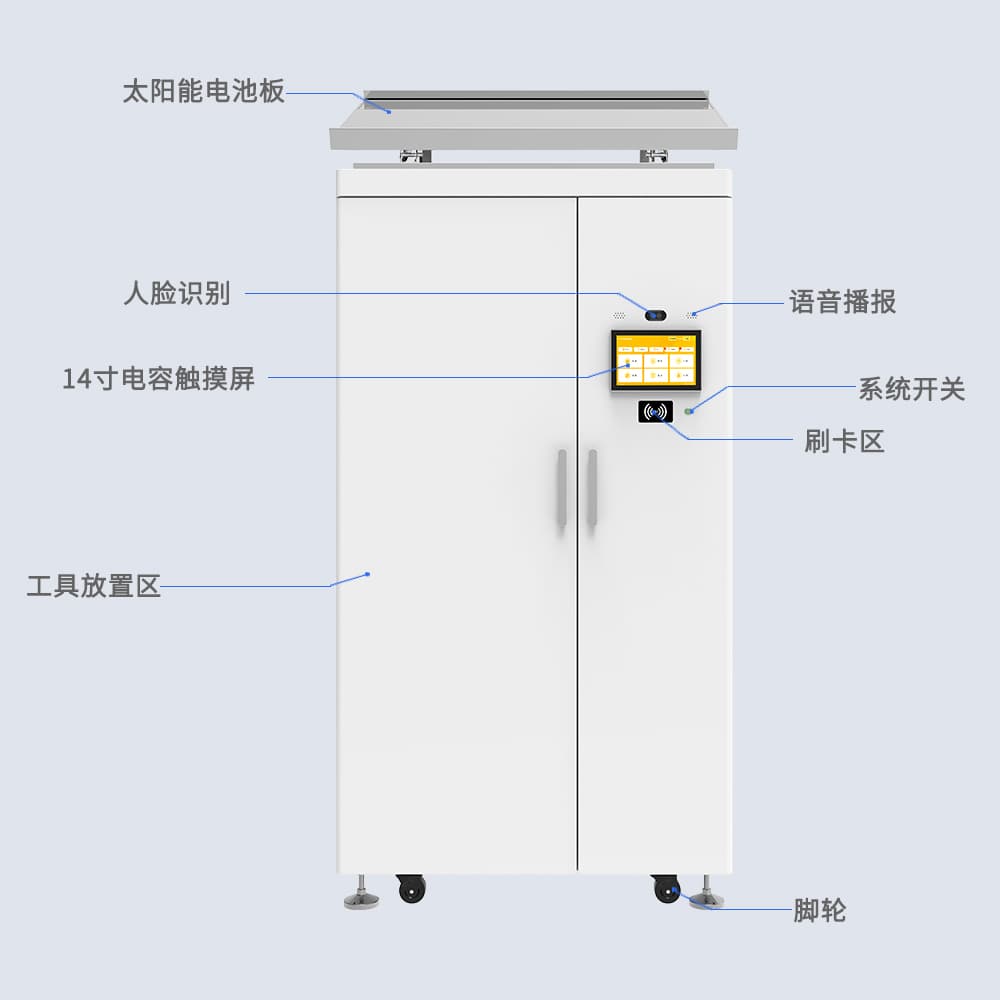 RFID智能工具柜,专为室外工具管理设计。集成太阳能供电与多种识别技术,实现工具自动盘点与权限管理。防水构造,适应极端连续阴天环境。高效数据传输,确保信息实时更新,简化工具管理流程。